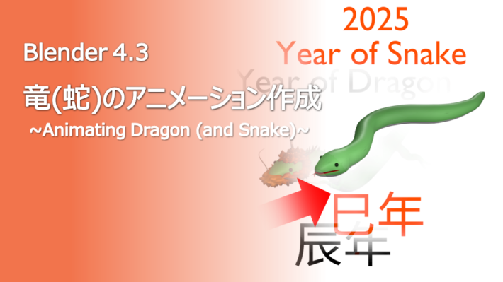 2025年は「巳年」(みどし)ですね。 2020年にBlenderを始めてから、丑、寅、卯、辰、と4年連続で干支をモデリングしてきましたが、今年は2024年の干支の「竜(辰)」から2025年の「蛇(巳)」への切り替わり( … 続きを読む 【Blender 4.3】竜(蛇)のアニメーション作成