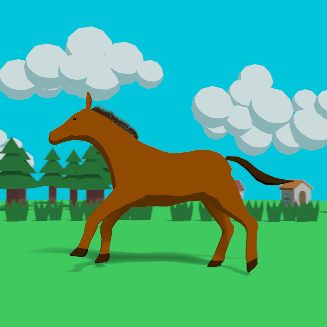 馬の走っている様子をリアルに見せるために、動画サイトで走行アニメーションを見て研究し、後ろ足で地面を蹴り、そのあと前脚で地面を蹴るようにキーフレームを設定しました。