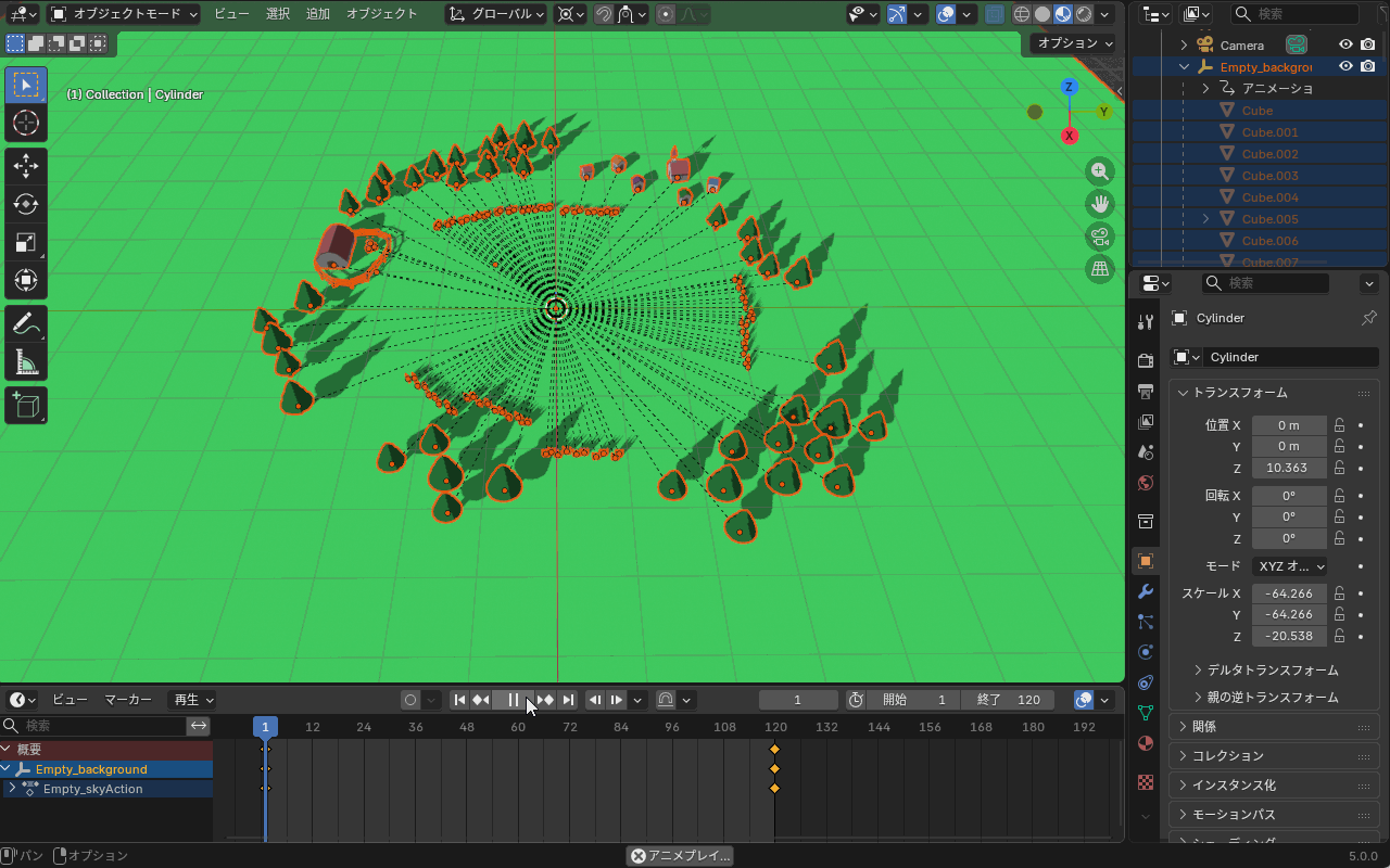 アニメーション再生すると、こちらのように120フレームで1/5周します。