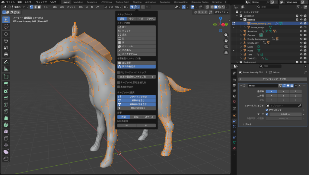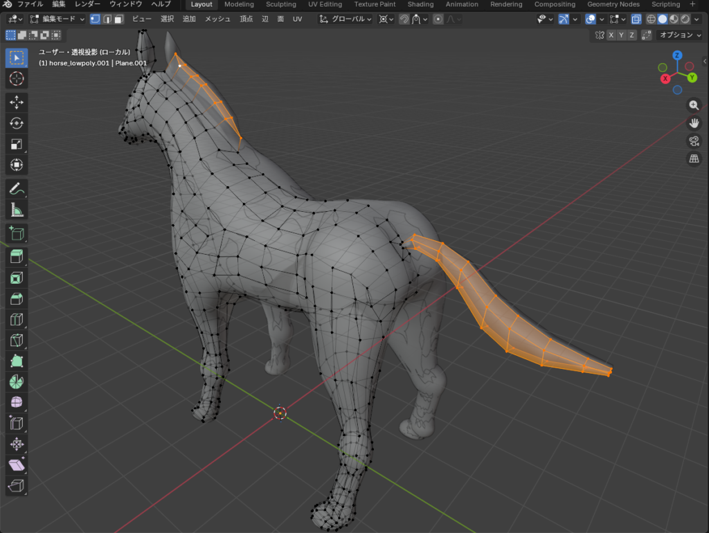 耳やたてがみ、しっぽの部分はスナップをOFFにし、メッシュを押し出して作成しました。