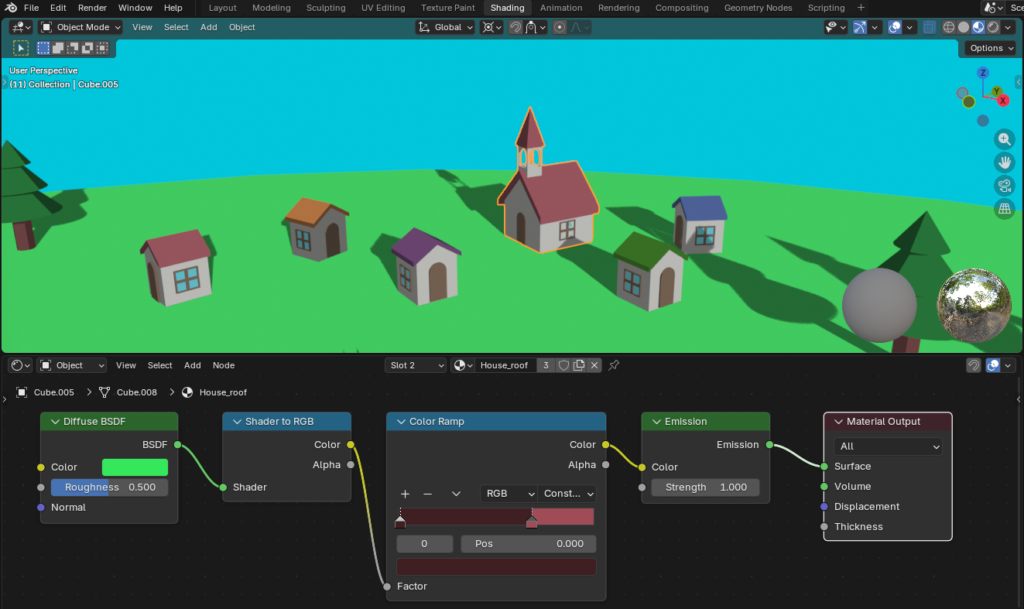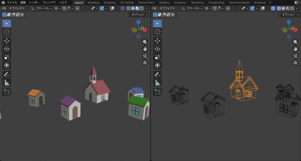 基本的なポリゴンモデリングで家や木・草などを作成しました。