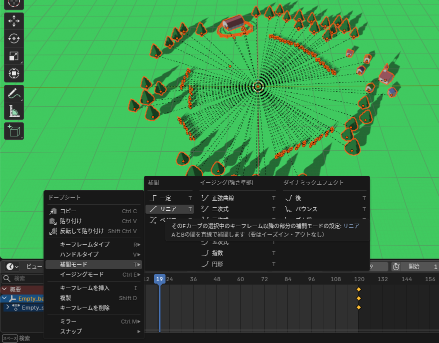 エンプティオブジェクトを追加し、120フレームで360°回転するようにキーフレームを設定します。
