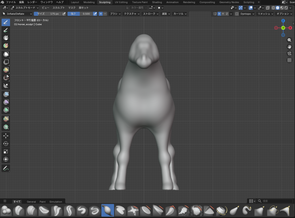 スカルプトしたモデルを前から見ると、こちらのようにかなりずんぐりむっくりしていますが、最終結果に反映されない部分は多少手を抜いても問題ありません。
